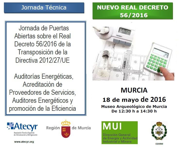 12:30 h. - Acreditación de Asistentes 12:45 h. - Bienvenida y Presentación de la jornada por Dña. Esther Marín Gómez, Directora General de Energía y Actividad Industrial y Minera. Consejería de Desarrollo Económico, Turismo y Empleo. Región de Murcia 13:00 h. Ponencia a cargo de D. Ricardo García San José, Vicepresidente del Comité Técnico de Atecyr.REAL DECRETO 56/2016 relativa a la eficiencia energética, en lo referente a auditorías energéticas, acreditación de proveedores de servicios y auditores energéticos y promoción de la eficiencia del suministro de energía.
