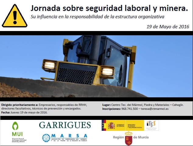 10:00h Inauguración. Dña. Esther Marín Gómez Directora General de Energía y Actividad Industrial y Minera 10:15h La Seguridad Minera. D. Rafael Sánchez Medrano Jefe de servicio de Minas 11:00h Campañas y planes de actuación de la Inspección de Trabajo. D. Diego Martínez Rafecas Jefe de la Inspección Provincial de Trabajo y Seguridad Social 11:45h Instrumentos para reducir la responsabilidad del empresario en materia de PRL, los mapas de responsabilidad. D. Felipe Cegarra Cervantes Asociado sénior de Garrigues 13:00h Proyectos de investigación más relevantes en materia preventiva desarrollados por el CTMARMOL. D. Francisco Hita López Responsable del ámbito de seguridad y salud del CTMARMOL 13:15h Mesa redonda. 13:45h Clausura de la jornada. D. Leopoldo Navarro Quílez Director General de Relaciones Laborales y Economía SocialOtra Información