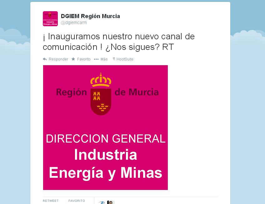 Como parte de un Proyecto Interno de mejora, la Dirección General de Industria, Energía y Minas inaugura una cuenta en Twitter ( @DgiemCarm ) que pretende ser un nuevo portal donde se difundan noticias, convocatorias, eventos y todo tipo de recursos del ámbito industrial, energético y minero.