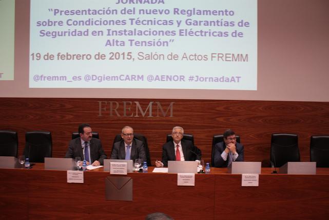 Ayer 19 de febrero, se celebró con gran éxito de asistencia la jornada "Presentación del nuevo Reglamento sobre Condiciones Técnicas y Garantías de Seguridad en Instalaciones Eléctricas de Alta Tensión. La Jormada fue inaugurada por el Director General de Industria, Energía y Minas, D. Alfonso Ramón García López, junto con el Presidente de la FREMM, D. Juan Antonio Muños Fernández, el Secretario General de la FREMM, D. Jose Daniel Martín González, y el Presidente del Gremio de Instaladores Eléctricos, D. Tomás González Olivares.