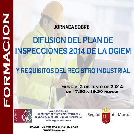 El próximo 2 de junio tendrá lugar en el Salón de Actos del COITIRM una Jornada Informativa en la que se presentará el Plan de Inspecciones 2014 de la DGIEM,a sí como la Resolución de actuaización del Registro de Establecimientos Industriales.