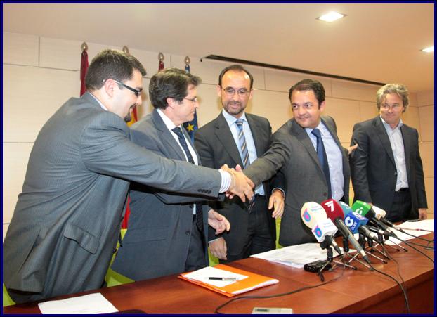 El consejero de Universidades, Empresa e Investigación, Salvador Marín, acompañado del alcalde de Lorca, Francisco Jódar, presidió hoy la firma del acuerdo de intenciones entre Andaltia y las multinacionales Schneider Electric y Sun Power para cooperar en el desarrollo de la central solar fotovoltaica de 400 megavatios (MW) y la posibilidad de poner en marcha centros productivos para dar suministro de tecnología y equipos.