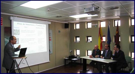 El consejero de Universidades, Empresa e Investigación, Salvador Marín, mantuvo hoy un encuentro con el Grupo de Excelencia Científica 'Hemostasia y Trombosis', del Centro de Hemodonación de la Región de Murcia, para conocer de primera mano y profundizar en la labor de investigación en torno a la trombosis, sus causas y los métodos para prevenir esta enfermedad que realiza este grupo, uno de los líderes mundiales en este campo.