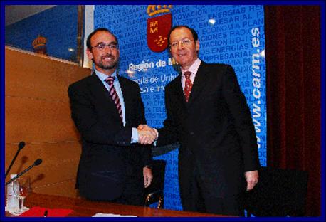 El consejero de Universidades, Empresa e Investigación, Salvador Marín, y el alcalde de Murcia, Miguel Ángel Cámara, firmaron esta mañana un convenio para dinamizar hasta 26 millones de metros cuadrados de suelo industrial de calidad para el asentamiento de empresas y proyectos de inversión para generar puestos de trabajo.